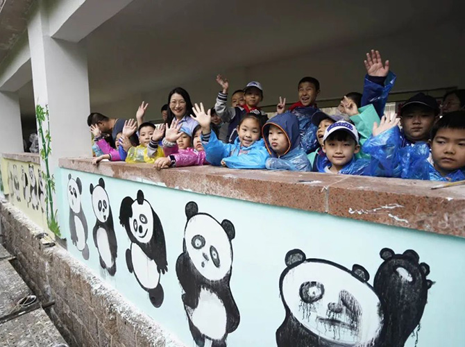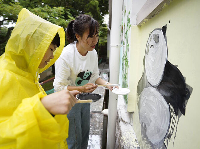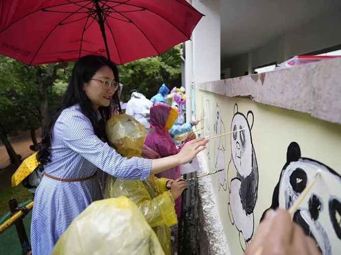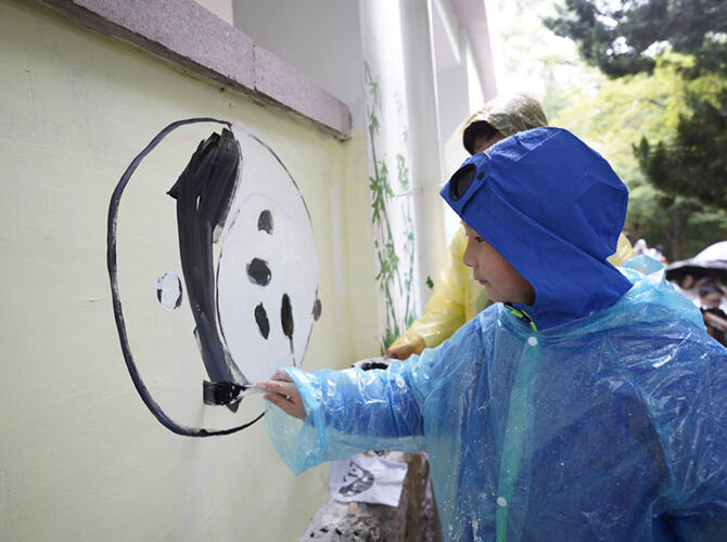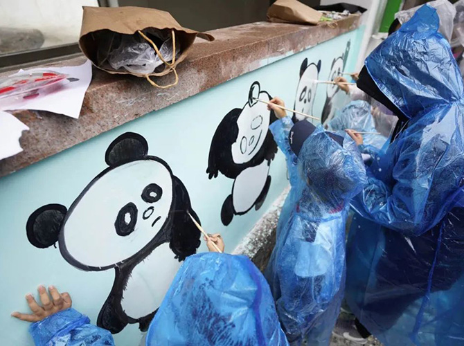 启动仪式结束后,20个市民家庭和青岛市园林和林业系统的志愿者一起利用闲置墙面,为熊猫谷项目送上了“欢乐熊猫墙”。大家用画笔在墙上以动物园两只大熊猫为原型画出了20只憨态可掬的熊猫。
