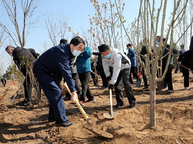 4月11日上午,来自中共中央直属机关、中央国家机关各部门和北京市的128名部级领导干部佩戴口罩统一乘车来到北京市通州区北京副中心城市绿心地块参加义务植树活动,栽植油松、法桐、银杏、国槐、八棱海棠等树木2050株。