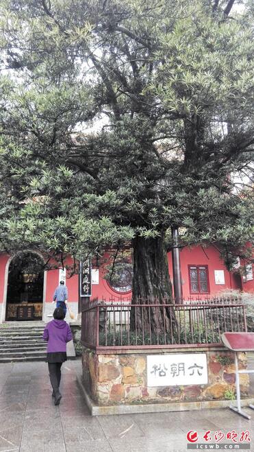“树龄最大的一株罗汉松六朝时代就有了,又称‘六朝松’,是岳麓山植物界的元老,弥足珍贵?!痹缆瓷椒缇懊でぷ魅嗽惫ㄏ壬樯埽藓核梢蛑肿铀仆纷?,镶嵌在肥大鲜红的种托上,宛如披袈裟的罗汉,故而得名“罗汉松”。据《岳麓书院续志》记载,乾隆年间,因遭遇大风天气,其中一棵罗汉松被连根拔起,于明代时期被补栽。而据《湘城访古录》记载,也有光绪年间,两棵罗汉松先后被风雨连根拔起一说。
